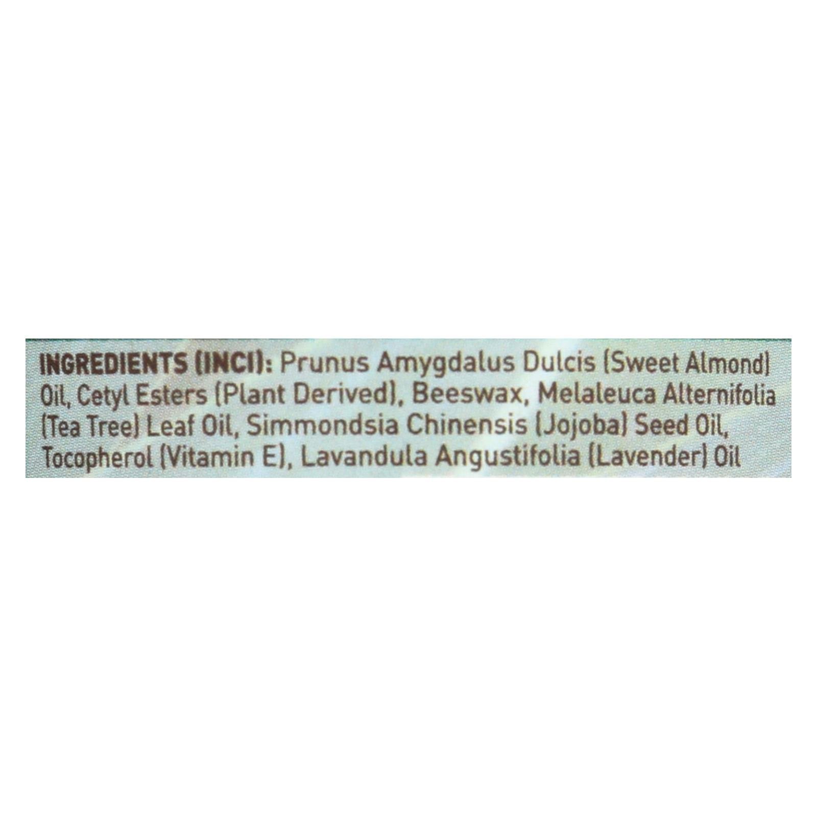 ingredients : prunus amygdalus dulcis;sweet almond;oil;cetyl esters;plant derived;beeswax;melaleuca alternifolia;tea tree;leaf oil;simmondsia chinensis;jojoba;seed oil;tocopherol;vitamin e;lavandula angustifolia;lavender