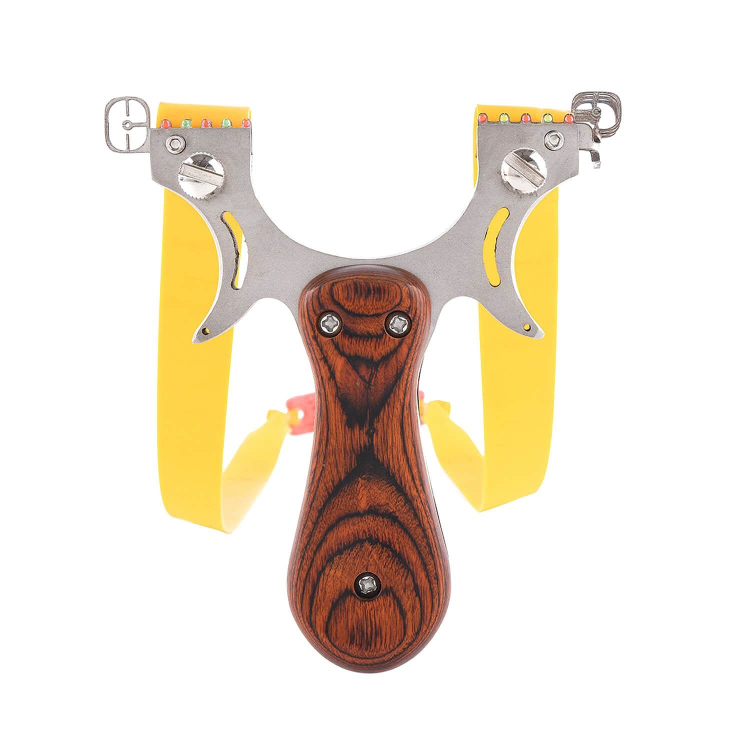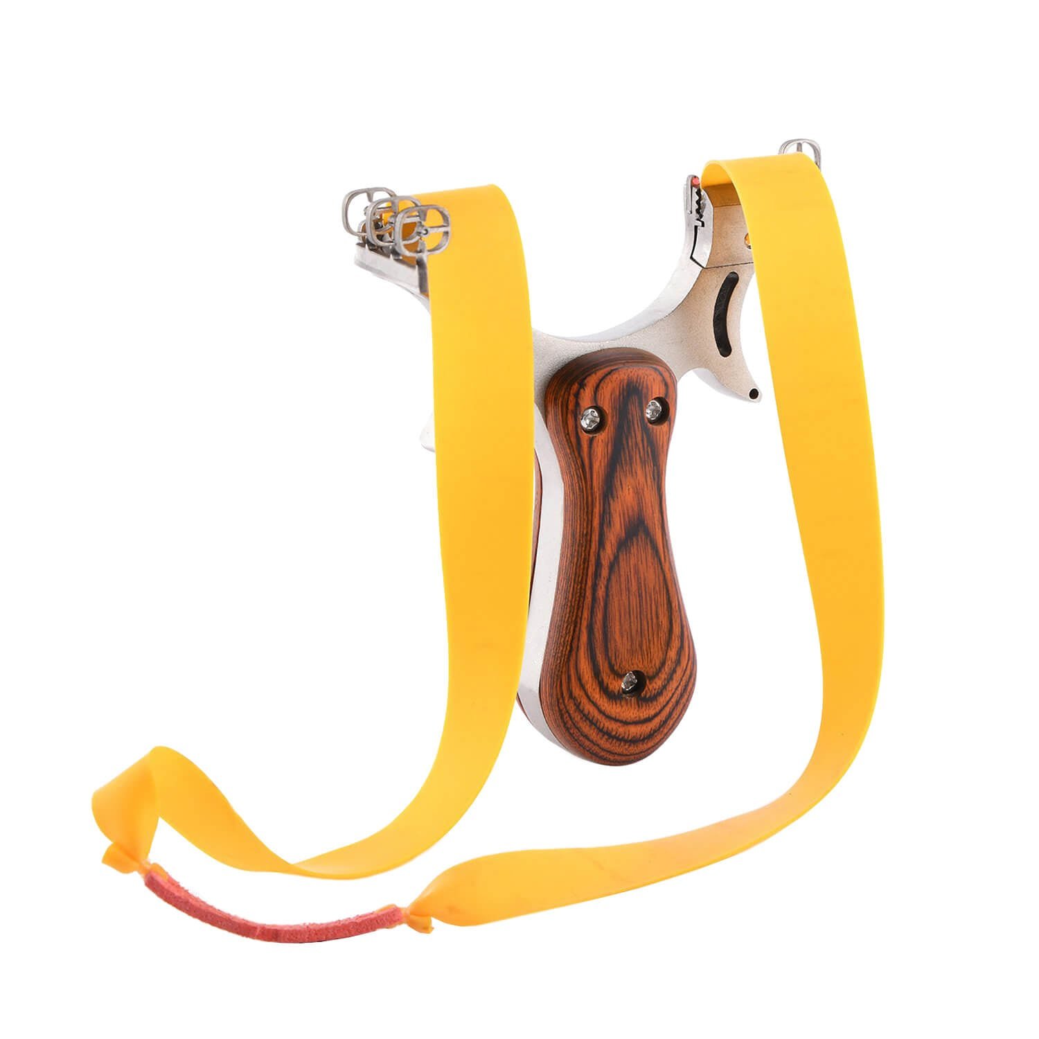 The Ballista 25 tactical slingshot comes with an ergonomic wood handle for beauty and comfort, two high tension rubber bands, and has a sturdy iron body for durability.