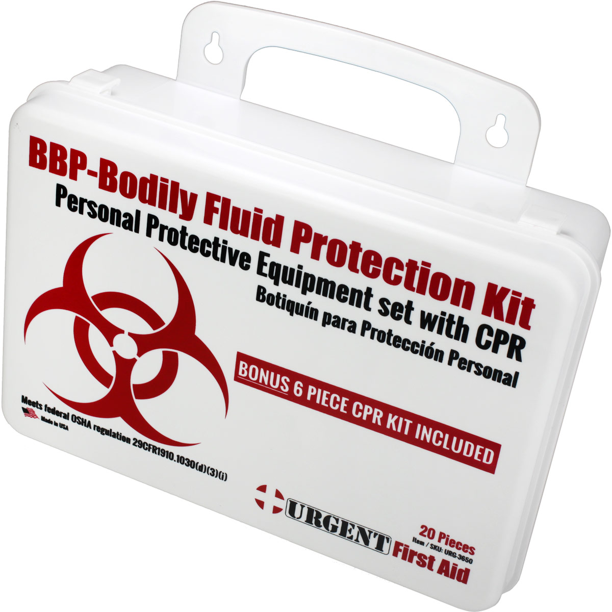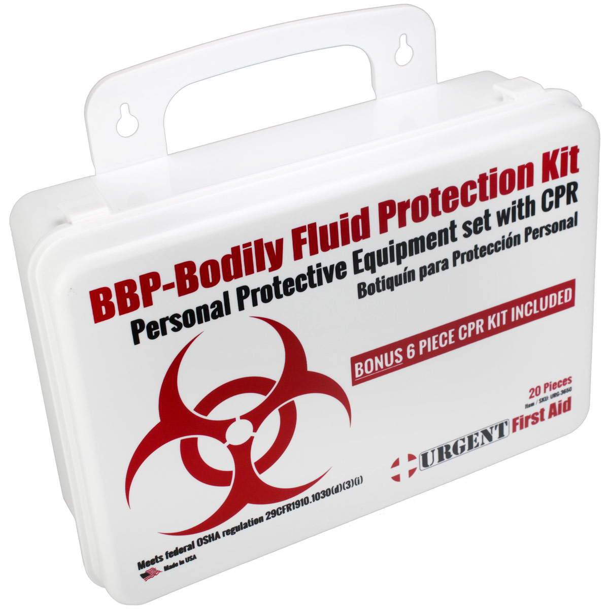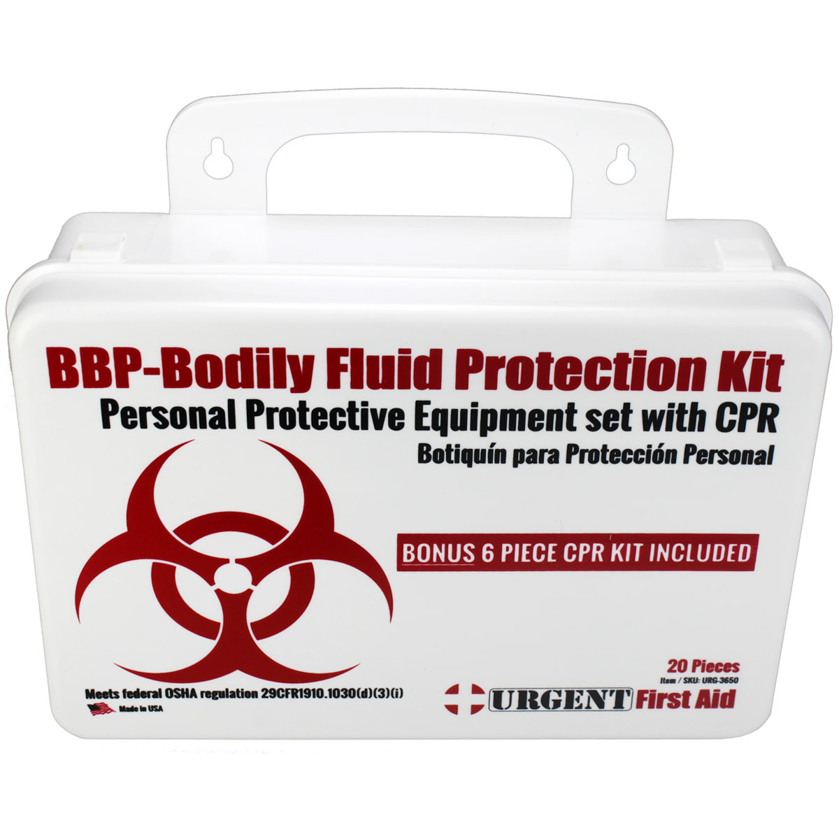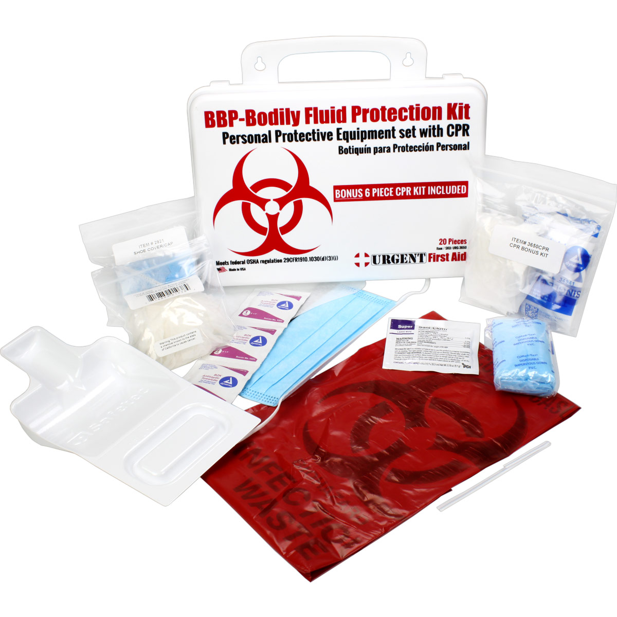 BBP / Bodily Fluid Protection  Kit with Bonus 6 piece CPR kit for additional Rescuer Protection Botiquín de protección personal OSHA compliant Personal Protection Kit, Bloodborne Pathogen (BBP) and Other Potentially Infectious Materials (OPIM) Bodily Fluid Spill Clean Up Kit includes a Bonus 6 piece CPR Pack, Plastic Case with gasket This Urgent First Aid™ 24-piece, personal protection kit is designed to guard persons attending to the injured or ill against contact with infections carried in blood and body fluids. Greatly reduce infectious risk factors your workers face every day from improper body-fluid spill clean-up. (Many companies specifically require this kind of protection.) This kit includes a CPR one-way valve face shield as part of the complete head-to-toe defense package against bio-hazardous contaminants. Every aspect of this kit meets with federal OSHA recommendations. Products are contained in a sturdy, reusable plastic case that can be easily carried or mounted on a wall. Our Made-in USA BBP kit is assembled in California in a gasketed case to help keep moisture and dust away from the content and keep your protective gear ready to use in an emergency. Meets federal OSHA regulation 29 CFR1910.1030 (d)(3)(i) - Satisface la regulación federal de OSHA Personal Protection Kit: